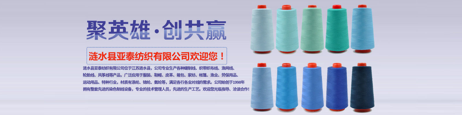 漣水縣亞泰紡織有限公司位于江蘇漣水縣,公司專業(yè)生產(chǎn)各種縫制線、織帶織布線、漁網(wǎng)線、輪胎線、風箏線等產(chǎn)品,廣泛應用于服裝、鞋帽、皮革、箱包、家紡、帳篷、漁業(yè)、勞保用品、運動用品、特種行業(yè),材質(zhì)有滌綸、錦綸、氨綸等,滿足各行各業(yè)對線的需求。公司始創(chuàng)于1998年,擁有整套先進的染色制線設備,專業(yè)的技術管理人員,先進的生產(chǎn)工藝。歡迎您光臨指導、洽談合作!